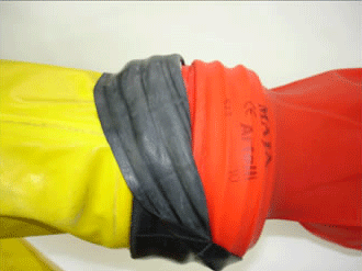 Special rims, that are made of flexible material with very elastic rubber rings, are attached to the sleeves and allow for quick and easy change of gloves without having to retract the sleeves to the inside.