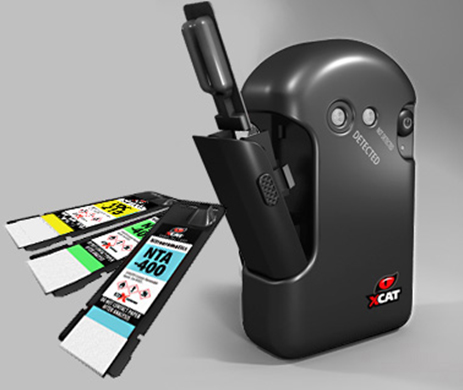 The XCAT handheld detection (Detector) for Narcotics, Homemade and High Explosives and Gunshot Residue The XCAT handheld detection system, which has just been selected as one of the year’s 12 Really Cool New Police Products by the POLICE® magazine, features automated, one-step detection of narcotics, homemade and high explosives, and gunshot residue. Use the XCAT for sampling suspicious drugs and other substances on hands, vehicles, packages and surfaces. The XCAT is intended for presumptive testing. Sampling cards are dedicated to detecting either individual analytes or groups of related analytes..